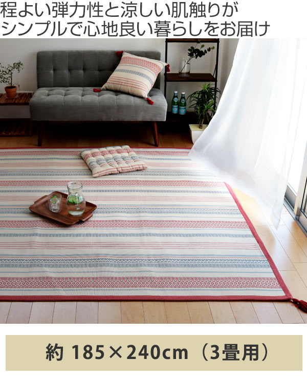 サイズ約 185×240(cm)厚さ0.3(cm)タッセルの長さ11(cm)内容量1枚材質表面:綿100%、中材:ウレタンフォーム(5-3mm)、裏面:不織布、タッセル付きカラーレッド、ブラック生産国インド製備考商品区分ラグ(その他サイズ)カテゴリから探すメーカー希望小売価格はメーカーカタログに基づいて掲載していますラグ マット ボンディングラグ テラ 185×240cm 夏用 3畳 インド綿思わずゴロゴロしたくなる心地良さ吸湿・発乾性が良いので、汗をかく季節にもサラッと爽やかな肌触りで快適に過ごせます。