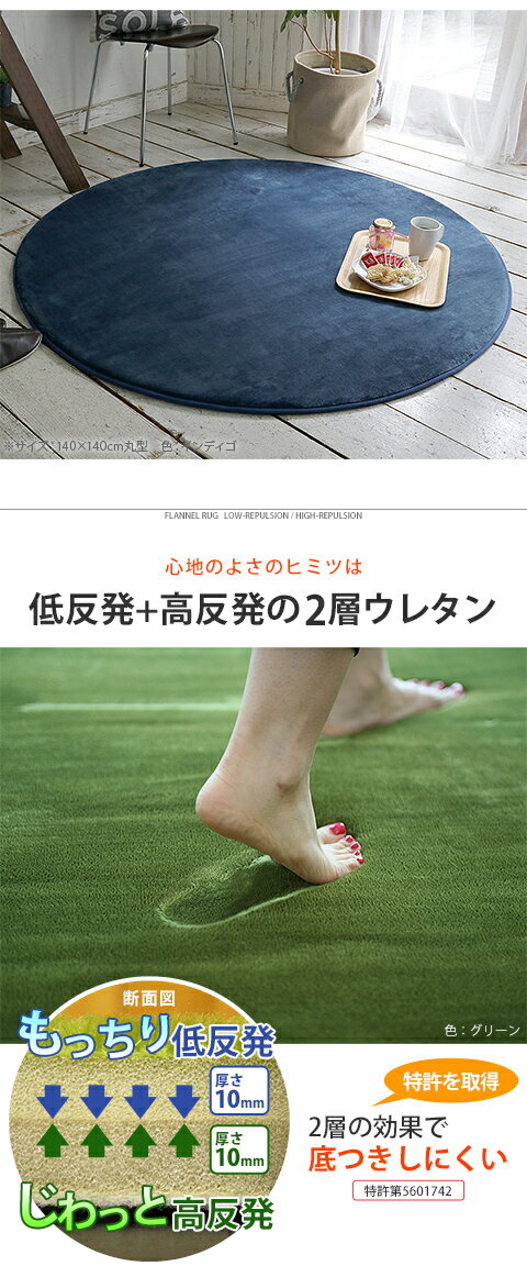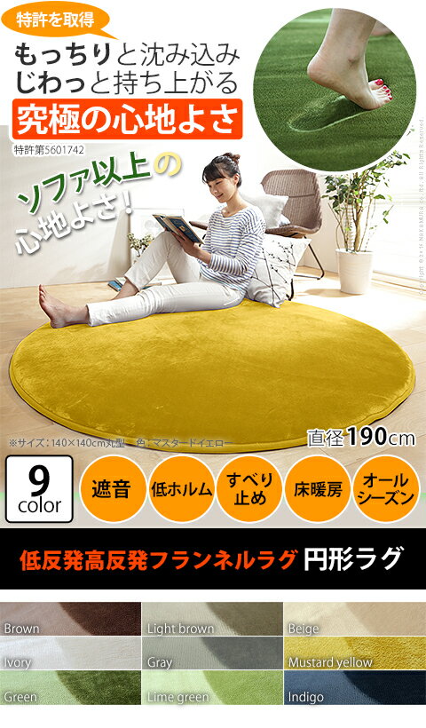 【カラーバリエーション】 ブラウン・ライトブラウン・ベージュ・アイボリー・グレー・マスタードイエロー・グリーン・ライムグリーン・インディゴ 【仕様】 本体:ポリエステル100%(フランネル) 裏面:不織布(滑り止め加工) 中材:ウレタンフォーム 【サイズ】 本体:直径約190cm ウレタン厚:約20mm(低反発10mm・高反発10mm) 毛足長さ(パイル):約3.5mm 重量:約5.5kg 株式会社ナカムラ(33100145)ラグ 厚手 防音 低反発高反発フランネルラグ 〔ステップ〕 円形190cm 無地 フランネル 極厚 ふわふわ 遮音 カーペット ラグマット 床暖房 ホットカーペット対応 リビング 滑り止め スミノエ【注意事項】こちらのページの商品は、メーカー直送の商品となります。