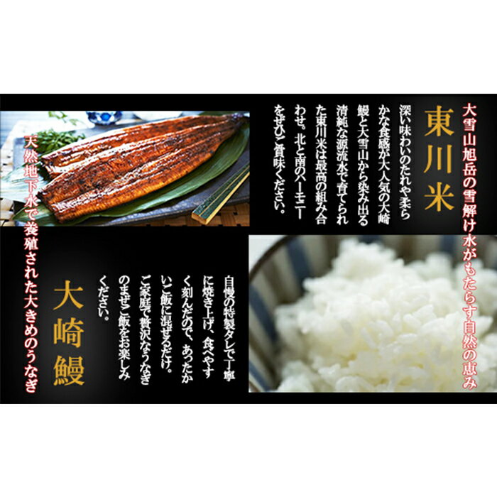 原材料名 1.北海道 東川町 2.うなぎ蒲焼き(鹿児島県製造)、ごぼうの水煮、還元水あめ、黒糖、しょうゆ、食塩/調味料(アミノ酸等)、カラメル色素、(一部に小麦・大豆を含む) 3.うなぎ(鹿児島県産)、しょうゆ(大豆・小麦を含む)、みりん、砂糖、醗酵調味料/増粘剤(加工でん粉)、着色料(カラメル) 内容量 1.東川米(無洗米)「ゆめぴりか」「ななつぼし」「きたくりん」各420g 合計1.26kg 2.大雪旭岳源水500ml×3本 3.乾燥三つ葉3g×1袋 4.山椒0.2g×12袋 5.大崎鰻まぜご飯の素 55g 2袋セット×3 合計330g 6.大崎鰻の蒲焼(常温)カット55g 2袋セット×3になります。