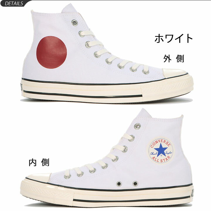◆ 商品詳細情報 ◆ ブランド コンバース【converse】 商品番号 3130208 商品名:ALL STAR US HINOMARU HI (オールスター US ヒノマル HI) カラー ホワイト 素材 アッパー:キャンバス アウトソール:ラバー サイズ 22.5cm(US3.5) - 28.0cm(US9.5) ※ハーフサイズあり ※当店で販売しております24.5センチは、[US5.5]になります。