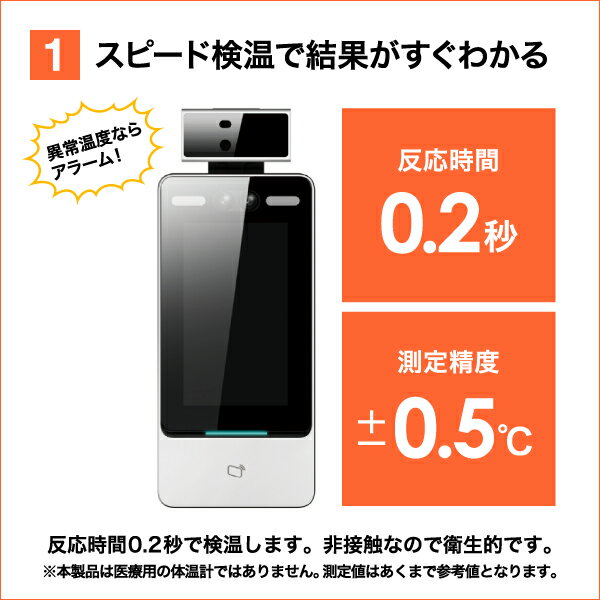 本機に顔をかざすと、入室者の顔認証と同時に約0.2秒というスピードで検温することができ、検温とセキュリティが1台で可能な商品です。
