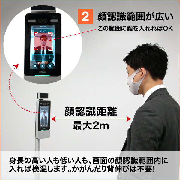 顔認識範囲も広く、画面の顔認識範囲内に入れば検温します。
