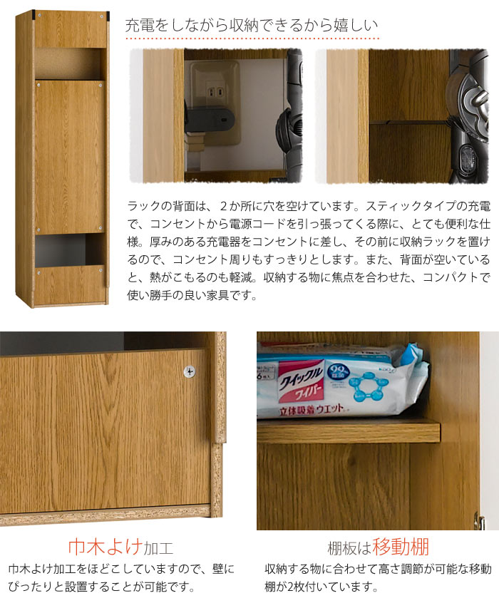 背面の一部が空いていますので、スティックタイプは充電をしながら収納ができ ます。