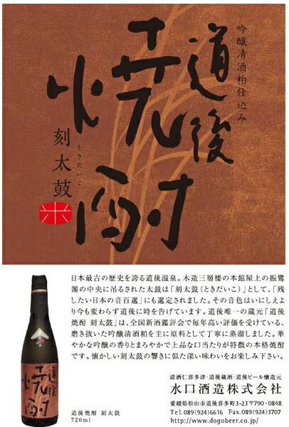 【刻太鼓】 「刻太鼓」は全国新酒鑑評会通算7度「金賞」受賞の最高品質酒「仁喜多津 大吟醸酒」の吟醸清酒粕をメインに使用する事により、大吟醸酒特有の華やかな香りを引き出し、日本酒の味わいも楽しめる焼酎です。