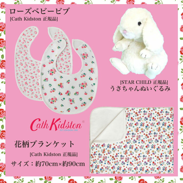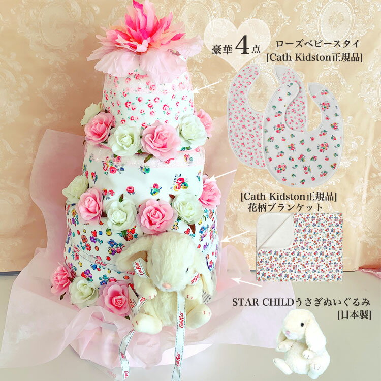 選べるおむつメーカー パンパース又はムーニー 選べるおむつサイズ 新生児・S・M サイズ おむつ枚数 なんと!70枚 グッズ内容 Cath Kidston花柄ブランケット(おくるみ)Cath Kidstonローズベビースタイ(よだれかけ)2枚【すべてCath Kidston正規品】STARCHILD うさぎぬいぐるみ 商品サイズ H約54cm×W約27cm×D約27cm ※花材やグッズは、季節によりアレンジや柄が多少変わる場合がございます。