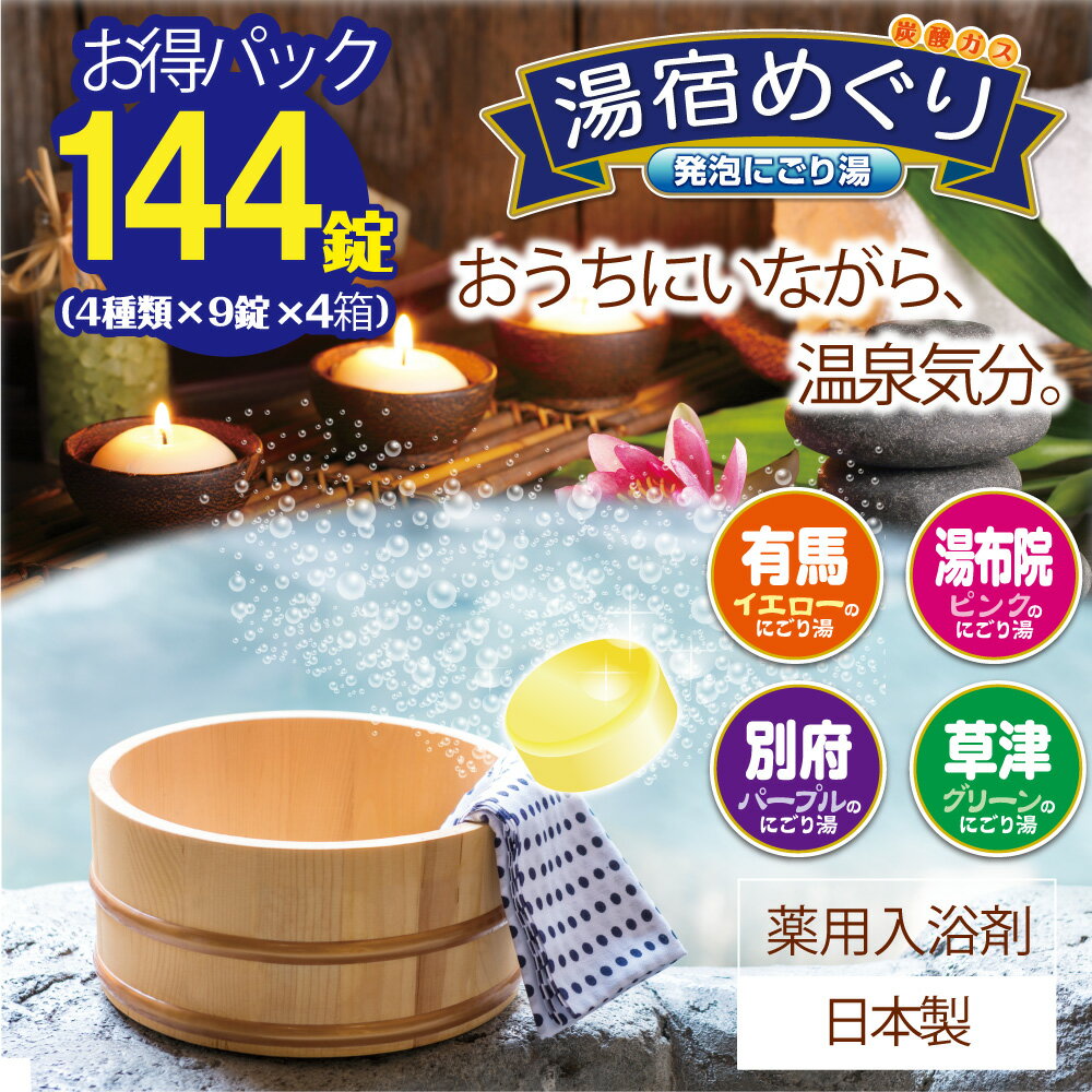 湯宿めぐり 発泡入浴剤 にごり湯 36錠入(4種×9錠) 4箱セット(計144錠) つめ合わせ 医薬部外品 【効能】 疲労回復、肩のこり、腰痛、冷え症、神経痛、リウマチ、荒れ性、あせも、しっしん、 しもやけ、ひび、あかぎれ 、にきび、痔、くじき、うちみ、産前産後の冷え症 【使用方法】 ・浴槽のお湯(160〜200L)に対し、本品1錠(40g)を使用してください。