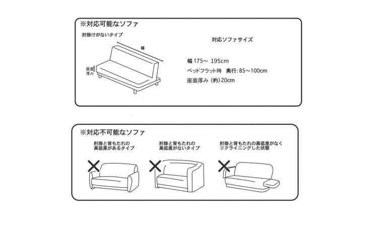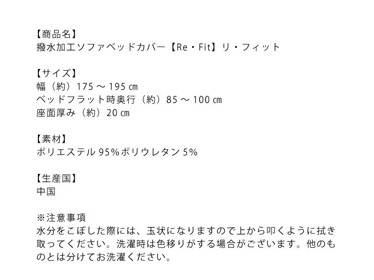サイズ幅(約)175〜195ベッドフラット時奥行(約)85〜100座面厚み(約)20素材ポリエステル95%ポリウレタン5%生産国中国※注意事項水分をこぼした際には、玉状になりますので上から叩くように拭き取ってください。