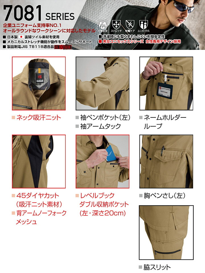 ■高品質な日本製ドビークロス点接触清涼素材を使用■優れた通気性と汗のべたつき解消など夏の暑さに対応■製品制電JIS T8118適合品バートル 7081シリーズ ジャケット レディースジャケット 長袖シャツ カーゴパンツ ユニセックスパンツ レディースカーゴ ⇒その他バートルはこちら
