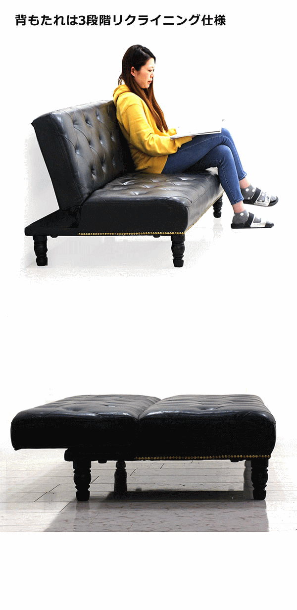ソファーベッド シングル 背もたれ 3段階 リクライニング 2人掛け 3人掛け 合皮レザー バイキャスト風 2way仕様 フロアタイプ ローソファ ロースタイル ソファベッド レトロ感 光沢 黒色 ブラック ダークブラウン ゴージャス 高級感 レトロ感