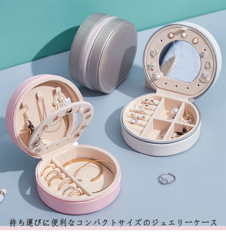 【GW限定★50%OFFクーポン 5/1〜5/6 9:59迄】アクセサリーケース 丸型 コンパクトなアクセサリーボックス 鏡付き 大切な指輪/ブレスレット/ネックレス/イヤリング/ピアス/口紅を保管 オシャレなジュエリーケース 可愛いカラー全3色 シックでシンプルがスタイリッシュ