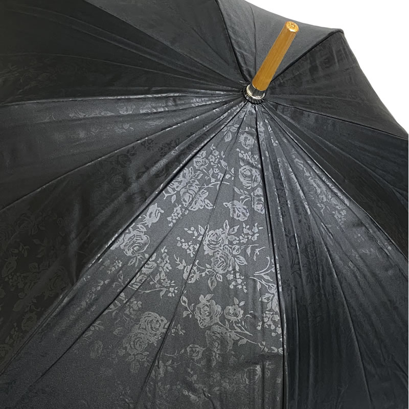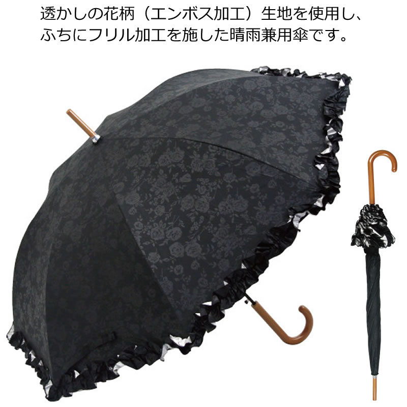 透かしの花柄(エンボス加工)生地を使用し、ふちにフリル加工を施した晴雨兼用傘です。