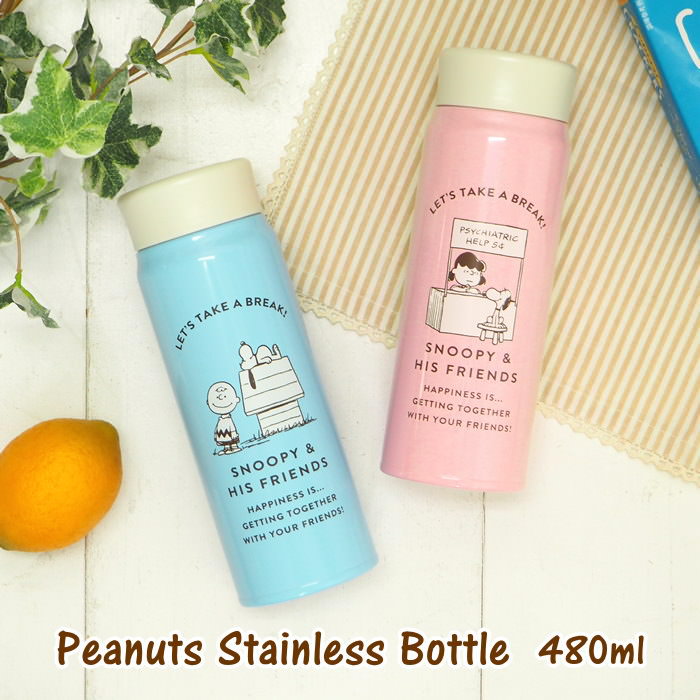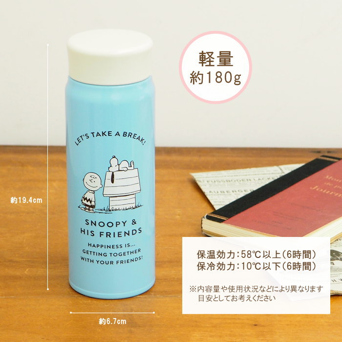 直飲みタイプの保温&保冷ステンレスボトル ・Spec 商品名 PEANUTS ステンレスボトル M TAKE A BREAK 素材 本体:ステンレス鋼(胴部:アクリル樹脂塗装) フタ・飲み口:ポリプロピレン パッキン:シリコーンゴム サイズ φ約6.7cm×h約19.4cm 容量:480ml 重さ:約180g 保温・保冷効力 保温効力(スタート95度):58度以上(6時間) 保冷効力(スタート4度):10度以下(6時間) ※内容量や使用状況などにより異なりますので、あくまでも目安としてお考えください。