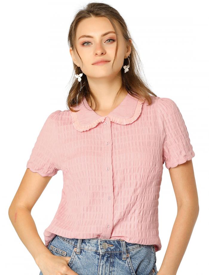 ソウテン 丸襟 ブラウス プリーツ シャツ ボタン 半袖 カジュアル レディース ピンク XL