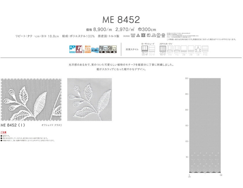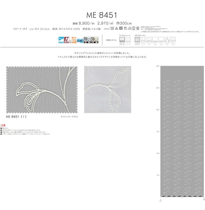 川島織物セルコン カーテン I'm アイム▼レース スタンダード縫製(下部刺繍)2倍ヒダ片開き▼ !'mシリーズ ME8455ウォッシャブル【製品幅251〜300×製品高さ101〜120cm】