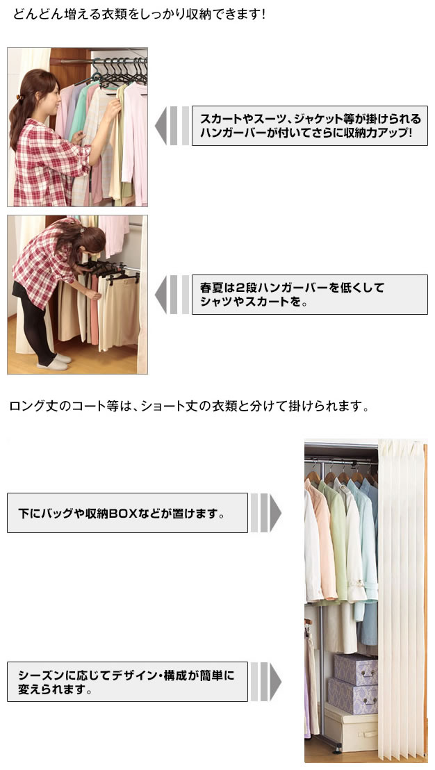 Closet Hanger Rack/クローゼットハンガー ハンガーラック クローゼット 伸縮式 収納 2段 ダブル カーテン付き 木製 カバー付き ワードローブ 衣類収納 横幅伸縮式クローゼットハンガーラック2段収納衣類の収納量に合わせて、横幅約118cm〜最大190cmまで伸縮可能なクローゼットハンガーラック。