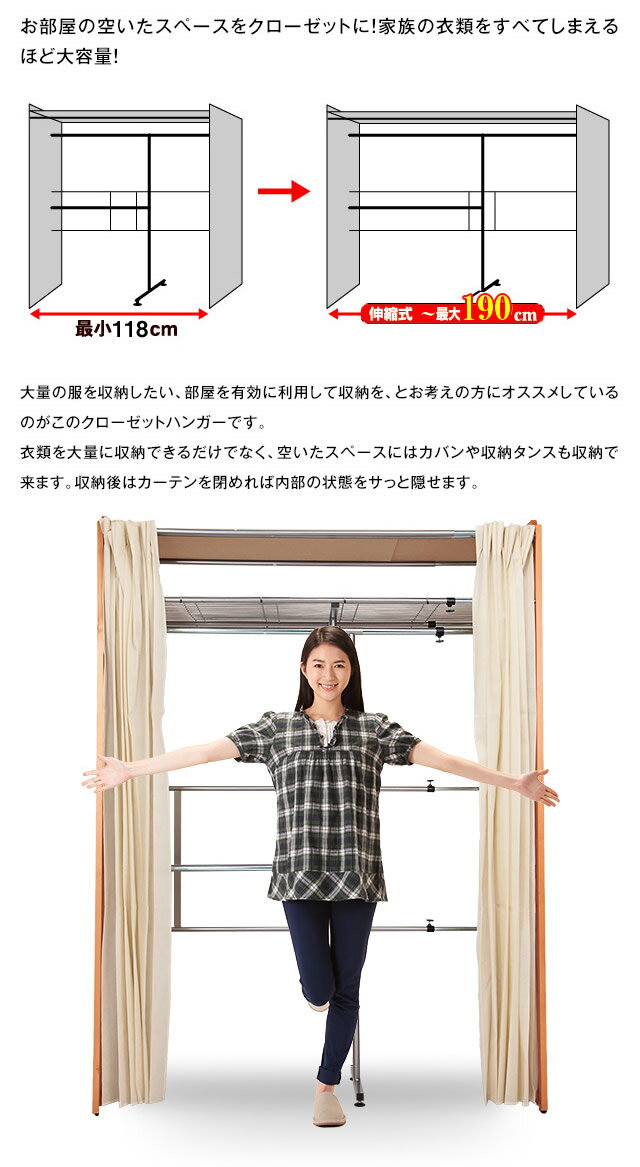 お部屋のスペース、衣類の収納量に合わせて、横幅約118cm〜最大190cmまで伸縮可能なクローゼットハンガーラック。
