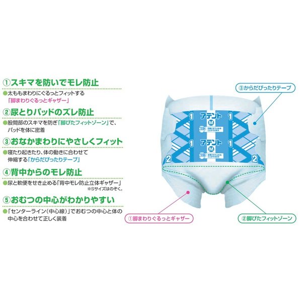 Rケア スーパーフィットテープ Sサイズ ケース(24枚×3パック) 大人用紙おむつ テープ止めタイプ 介護用 紙おむつ 【スキマを防いでモレ防止】太ももまわりにぐるっとフィットする『脚まわりぐるっとギャザー』【おむつの中心がわかりやすい】センターライン(中心線)でおむつの中心と体の中心をあわせて正しく装着 DETAILディテール ITEM INFORMATION商品詳細 商品名 Rケア スーパーフィットテープ Sサイズ ケース(24枚×3パック) 大人用紙おむつ テープ止めタイプ 介護用 紙おむつ 内容量・サイズ・素材 内容量:24枚 (1ケース3パック入)サイズ:ヒップサイズ57〜74cm●尿とりパッドのズレ防止、股間部のスキマを防ぎ『脚ぴたフィットゾーン』で、尿とりパッドを体に密着●おなかまわりにやさしくフィット、寝たり起きたり、体の動きにあわせて伸縮する『からだぴったりテープ』●背中からのモレ防止、尿と軟便をせき止める「背中モレ防止ギャザー」●スキマを防いでぴったりフィット 備 考 ・Rケア※・通気性シート・クロスライクバックシート・消臭加工・医療費控除対象商品※動きによるモレを軽減することで、「自分らしさを実感」し、日常生活を快適に過ごしていただくお手伝いをします。